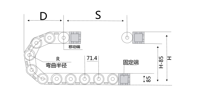 示意圖技術參數(shù)節(jié)距=46mm,每米節(jié)數(shù)=22,鏈長=S/2+K,S=行程距離,K=π.R+"安全量"R125150200......