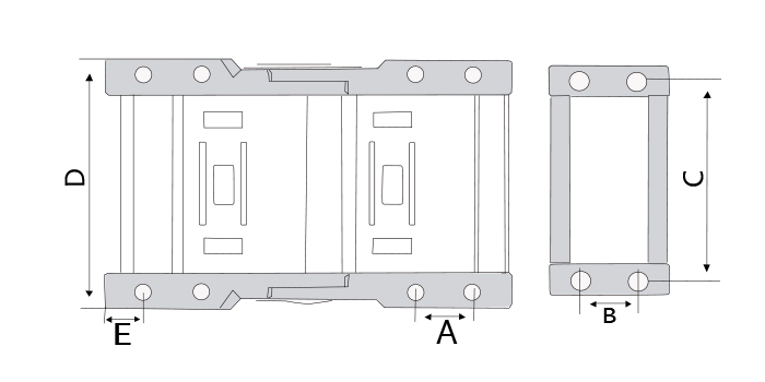 | 序列號 | 內高 | 內寬 | 外高 | 外寬 | 彎曲半徑(R) | 打開方式 | 節(jié)距 | A | B | C | D | E | 孔距 |