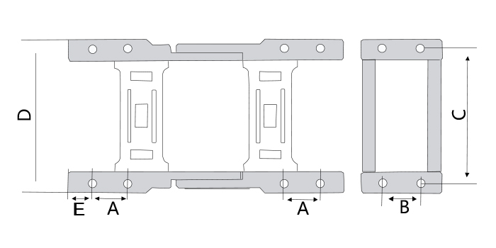 系列號(hào) | 內(nèi)高 | 內(nèi)寬 | 外高 | 外寬 | 彎曲半徑(R) | 打開(kāi)方式 | 節(jié)距 | A | B | C | D | E | 孔距 |
